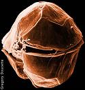 La même page permet d'ailleurs de constater, photos à l'appui, que, curieusement, les algues toxiques telle l'Alexandrium Tamarense ci-dessus à droite, (au demeurant beaucoup moins diverses que les autres phytoplanctons) qui prolifèrent à la suite d'inondations dévastatrices (que l'on sait riches en nitrates) résistent beaucoup mieux aux UV B puisqu'elles peuvent former une véritable marée rouge sur le Saint-Laurent en plein mois d'août. Ils ont donc mis en place un réseau de surveillance semblable à celui de l'