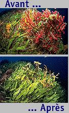 EL NIÑO et surtout la pénétration des UV B qui sont quasiment absorbés par la mer jusqu'à 40 mètres de profondeur. Et l'on est bien contraint de constater qu'il n'y a plus grand chose à faire pour retrouver un jour la magnifique et abondante ceinture de fucus rouges décrite et photographiée voici plus de 50 ans par M.STEPHENSON. On voit bien à travers cet exemple, assez exceptionnel, que les modifications profondes apportées à l'Ecosystème marin se font quasiment sans "billet de retour". Sous une autre forme plus brutale, le site australien spécialisé dans les algues