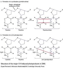 En effet, l'énergie mutagène des UV se limite-t-elle uniquement au déclenchement des mélanomes. Deux biologistes Indiens, Rajeshwar P. Sinha and Donat-P. Häder, ont découverts en 2002 deux nouveaux types de lésions de l'ADN pouvant être provoqués par les UV dans la bande respective des fréquences de 254 et 312 nm. Ces deux biologistes n'ont pas seulement mis au point une méthodologie pour inventorier les dommages pouvant être causés à l'ADN. Ils ont constaté que si des bactéries, champignons, plantes, invertébrés et même quelques vertébrés avaient mis en place des mécanismes de réparation (après excision) des sections d'ADN attaquées pour restaurer les informations génétiques indispensables à la vie, les humains en étaient actuellement totalement dépourvus.