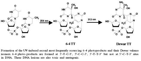 (formation d'un dimer de pyrmidine cyclobutane qui va lui-même être dénaturé une seconde fois par les UV-B) précisément décrites dans l'illustration ci-contre à droite