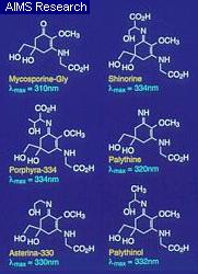 Mais, sur ce dernier sujet, la source d'informations la plus claire est certainement le site australien de l'AIMS (cliquer sur la deuxième photo du cadre à gauche ci-contre) qui livre même les formules chimiques des MAAs, ces poisons fabriqués par les algues [cyanobacteria, microalgae (phytoplankton) and macroalgae (seaweeds), comme on l'a déjà vu ci-avant], les plus couramment trouvés dans les récifs coralliens morts